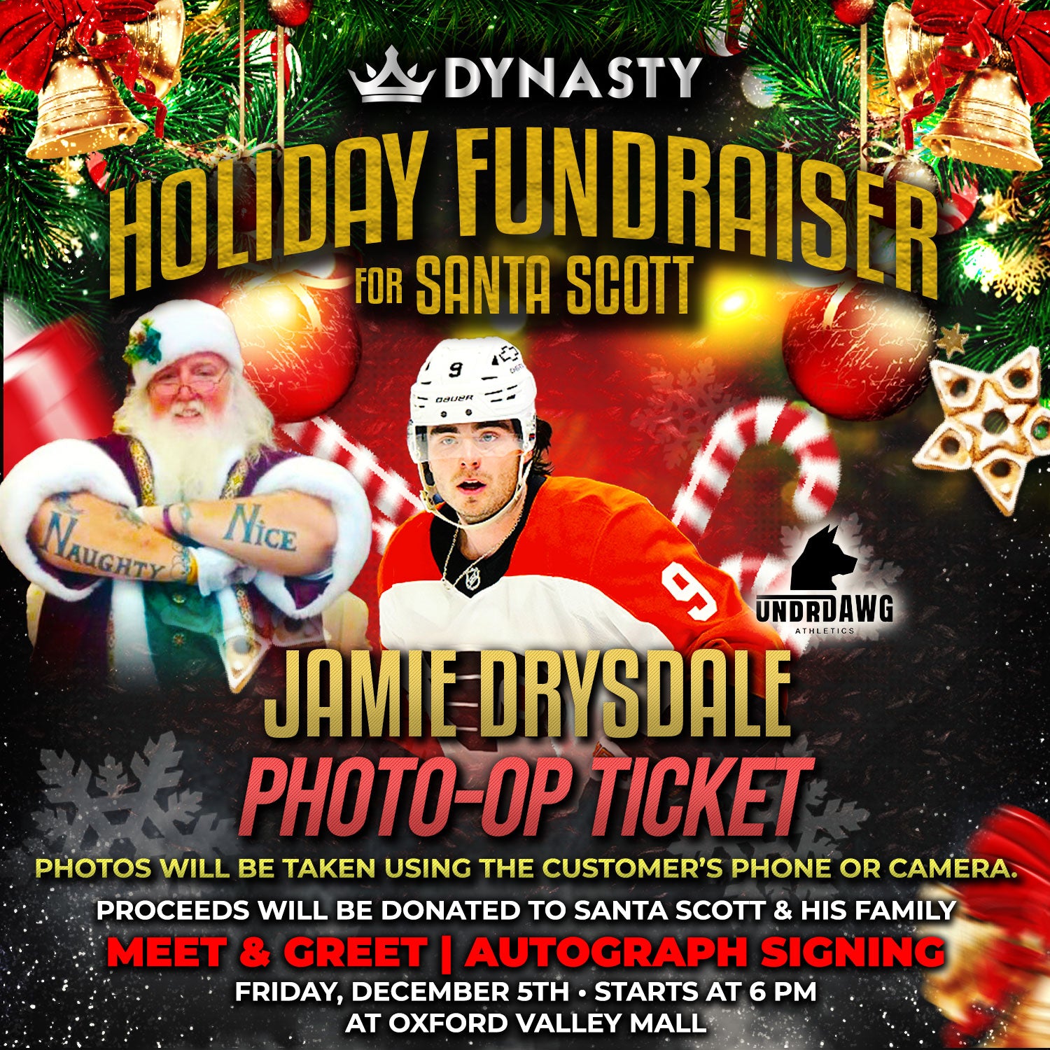 Dynasty Sports is calling on all of our friends, families, and fans, to help us bring joy back to Santa Scott and his wonderful family on Friday, January 16, 2026 at our Oxford Valley Mall location. We have reached out to our three friends from the Philadelphia Flyers, Owen Tippett, Tyson Foerster, & Jamie Drysdale as they will be joining us in our efforts to give back this holiday season. This is your opportunity to meet the trio of athletes and be a part of a special night for a truly special individual. The festivities will begin at 6pm. A portion of all proceeds from your ticket will be donated directly to Santa Scott & his family.