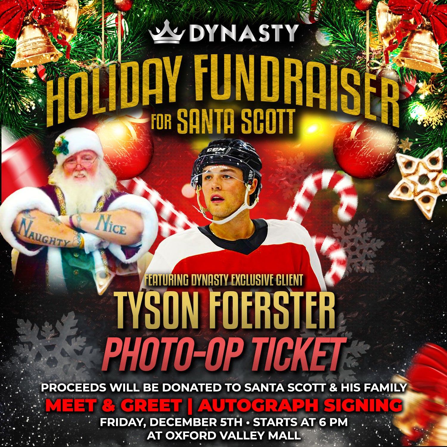 Dynasty Sports is calling on all of our friends, families, and fans, to help us bring joy back to Santa Scott and his wonderful family on Friday, December 5, 2025 at our Oxford Valley Mall location. We have reached out to our two friends from the Philadelphia Flyers, Owen Tippett & Tyson Foerster, as they will be joining us in our efforts to give back this holiday season. This is your opportunity to meet both athletes and be a part of a special night for a truly special individual. The festivities will begin at 6pm. A portion of all proceeds from your ticket will be donated directly to Santa Scott & his family.