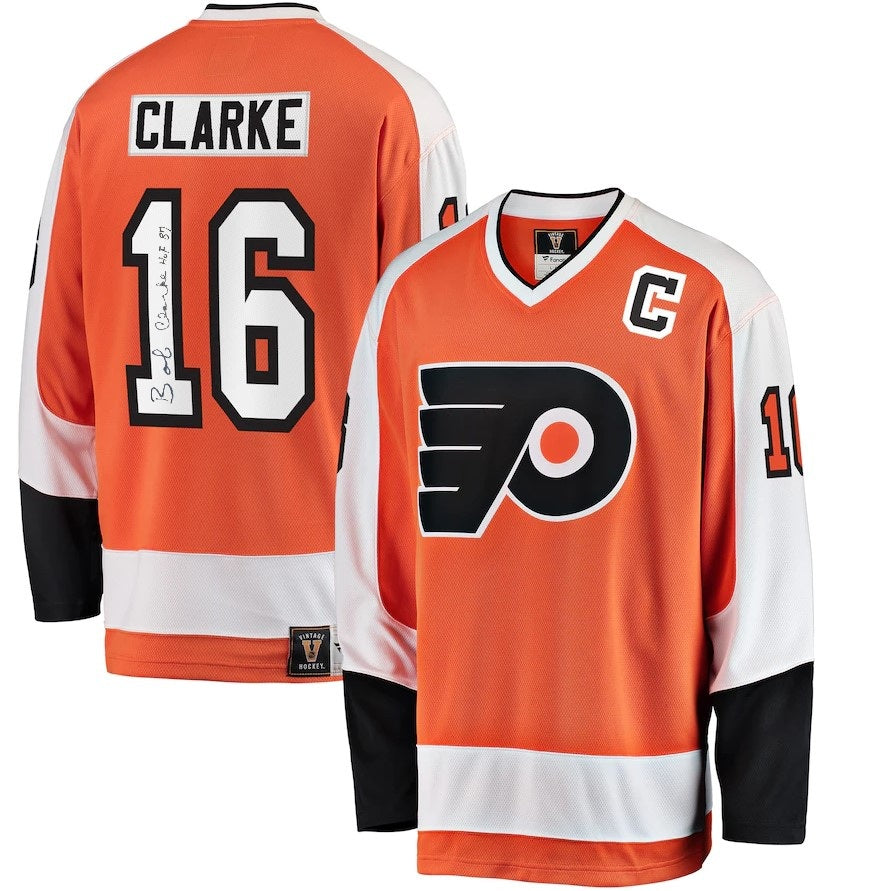 Officially licensed Mitchell & Ness jersey hand-signed by Flyers legend Bob Clarke - authenticated by Dynasty Sports during a private autograph signing on October 1, 2025