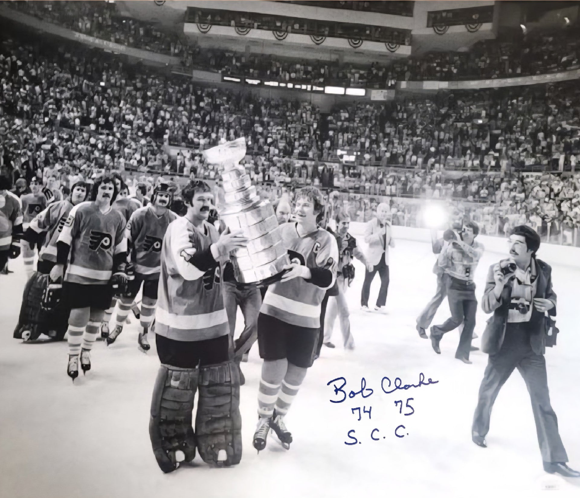 A classic photo showcasing Philadelphia Flyers Captain, Bob Clarke, hoisting the Lord Stanley alongside Flyers all-time great and NHL Hall of Famer, Bernie Parent. The photo will come personally hand-signed by Bob Clarke.