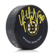 This officially licensed Boston Bruins puck has been hand-signed by Bruins goalie legend, Stanley Cup champion, and Vezina Trophy winner Tim Thomas. It has been authenticated by Dynasty Sports during a public autograph signing.