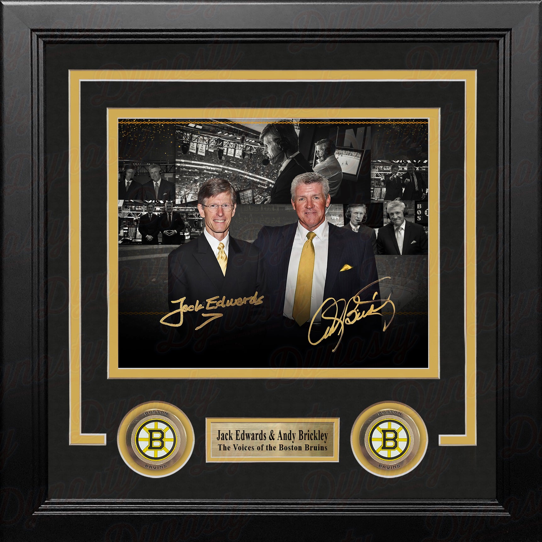 This collage-style hockey photo has been signed by Boston Bruins announcers Jack Edwards & Andy Brickley. It has been authenticated by Dynasty Sports during a public autograph signing
