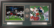This framed photo collage shows two legendary Super Bowl plays in Philadelphia Eagles history and two legendary defensive players. The left photo shows Brandon Graham delivering a pivotal strip-sack to Patriots quarterback Tom Brady to seal the Eagles win in Super Bowl LII, and the right photo shows Jalen Carter crushing Patrick Mahomes during the Eagles' dominant win over the Kansas City Chiefs in Super Bowl LIX. Both photos have been hand-signed. The autographs have been authenticated by Dynasty Sports during public autograph appearances.