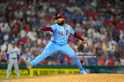 This officially licensed photo showcases Philadelphia Phillies star pitcher Jose Alvarado in action on the mound in the Phillies throwback colors.