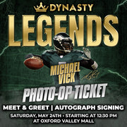 Mike Vick Photo-Opportunity Ticket: $85-Entitles you to receive one posed photo-op with Mike Vick. Our photographer will take your photo posing with Mike. You will receive a printed copy of the photo within a few days of the event. Additionally, all photos will be posted on our Facebook page.