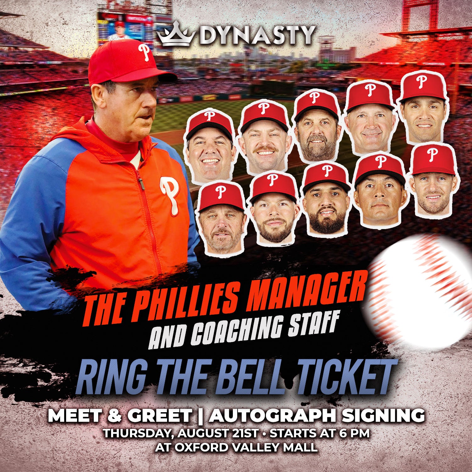 Dynasty Sports & Framing is excited to announce an extremely rare Experience featuring all eleven members of the red-hot Phillies coaching staff including Manager, Rob Thomson. Meet the men behind the NL East-leading Phillies on Thursday, August 21, 2025, at our Oxford Valley Mall location. All eleven members of the coaching team will be appearing beginning at 6pm where they will be signing autographs for the fans who attend. The Phillies are the talk of baseball becoming the favorites to make it to the World Series. Here is your rare opportunity to start your team-signed piece highlighting the season.