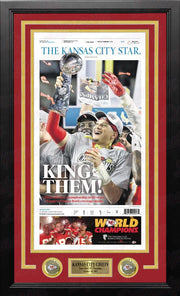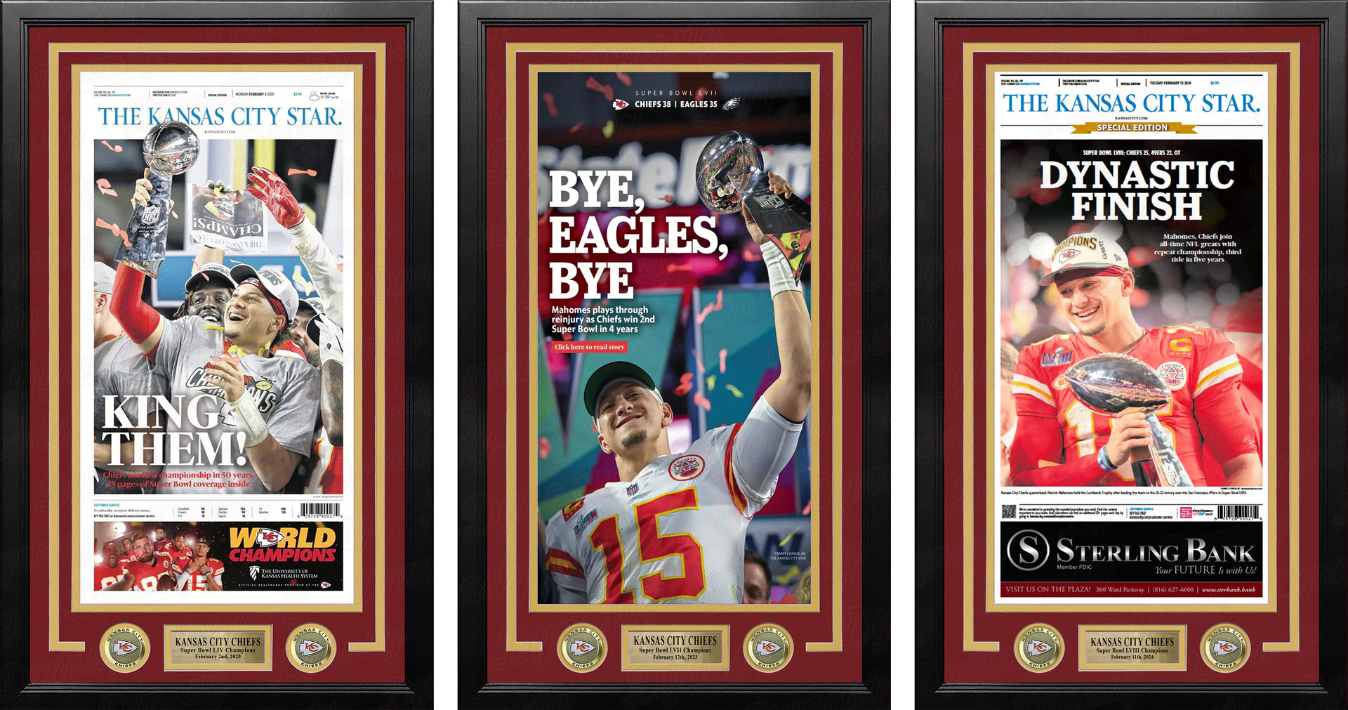 These official Kansas City Star newspapers feature Kansas City Chiefs superstar quarterback Patrick Mahomes; the newspapers were released after the Chiefs victories against the San Francisco 49ers in Super Bowl LIV and Super Bowl LVIII and against the Philadelphia Eagles in Super Bowl LVII.