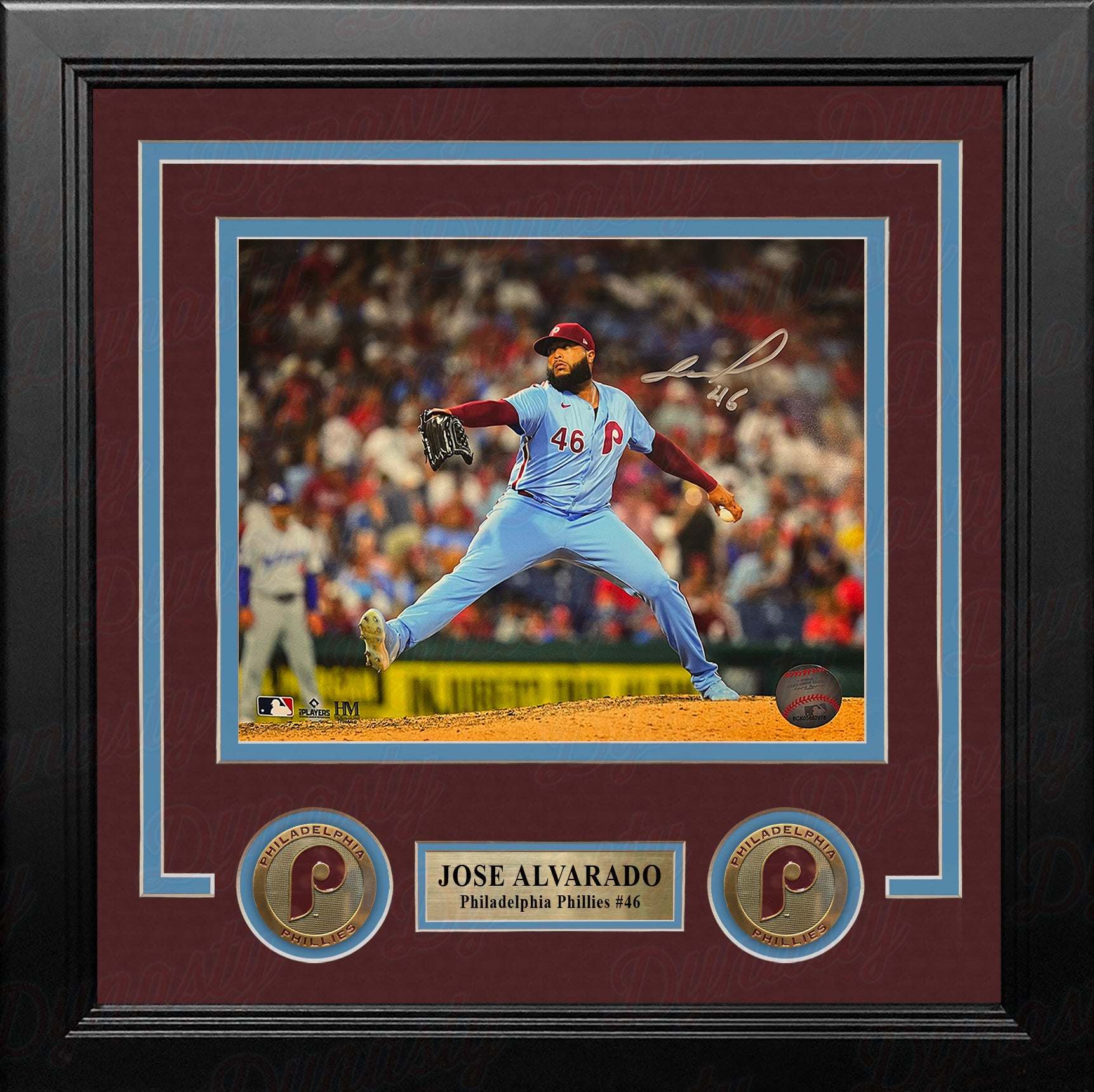 This officially licensed photo has been hand-signed by Philadelphia Phillies star pitcher Jose Alvarado. It has been authenticated by Dynasty Sports during a public autograph appearance on July 25, 2024.