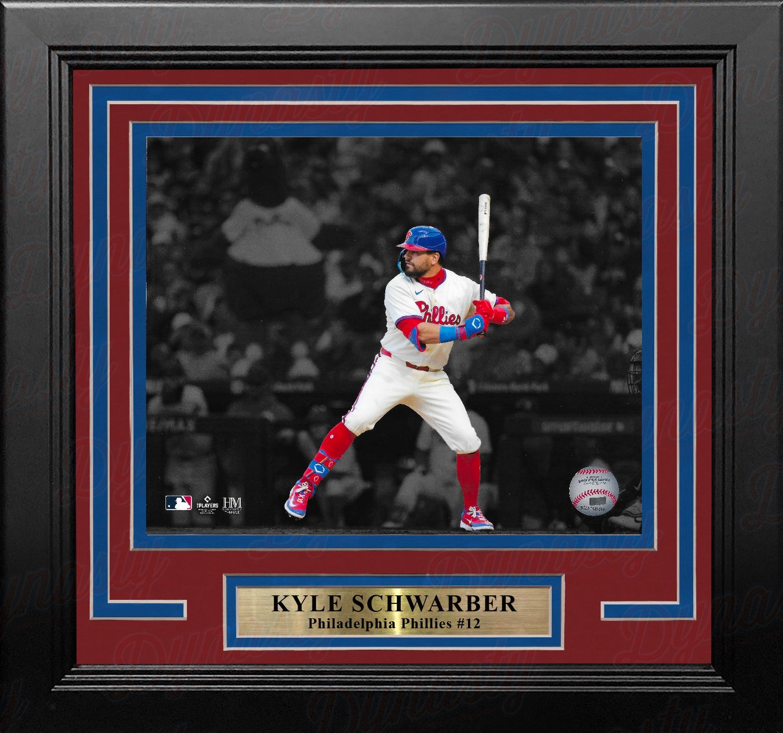 This officially licensed photo shows Philadelphia Phillies slugger Kyle Schwarber in blackout-style photography.