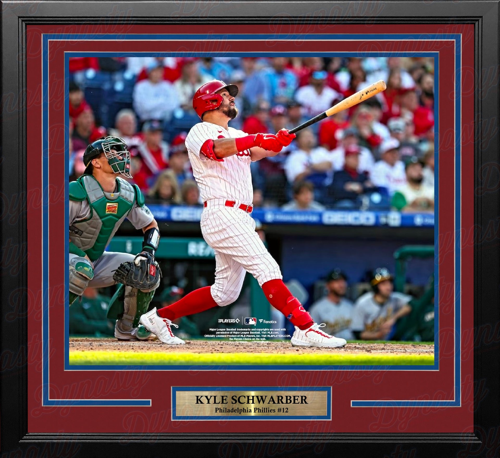 This officially licensed photo shows Philadelphia Phillies slugger Kyle Schwarber making a giant home run swing at the plate.