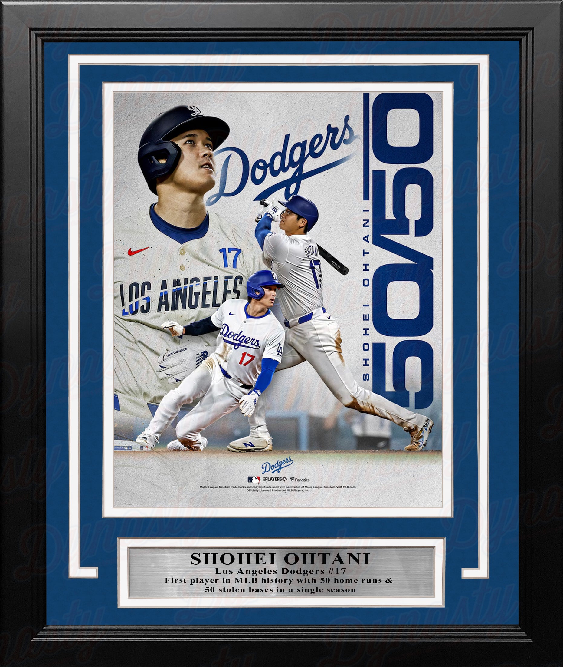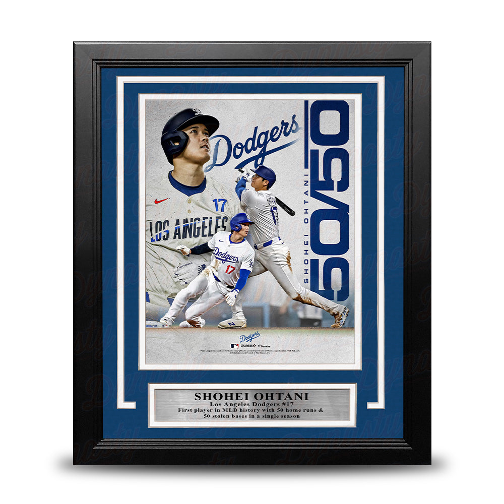 Celebrate the induction to the 50/50 Club of Los Angeles Dodgers superstar Shohei Ohtani with this officially licensed Season Record Collage. It features commemorative graphics to celebrate Ohtani becoming the first ever player to hit 50 home runs and and steal 50 bases in the same season.