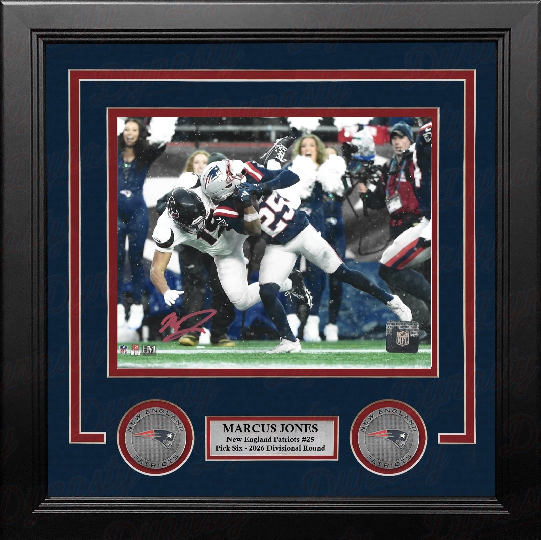 Capture one of the most electrifying moments in New England Patriots playoff history with this autographed 8" x 10" photo of Marcus Jones. The image features Jones picking off CJ Stroud and running it back for a pick 6 against the Houston Texans during the AFC Divisional Round of the NFL Playoffs, a game-changing play that ignited Patriots fans everywhere. The photo was signed by Marcus during his public autograph signing at our Northshore Mall location (Peabody, MA) on 01/23/2026.