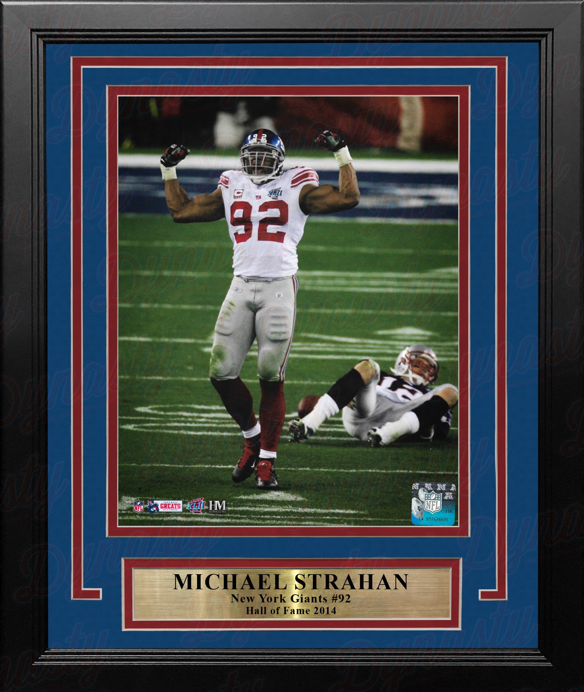This officially licensed photo showcases New York Giants legend Michael Strahan celebrating after sacking Tom Brady during Super Bowl XLII.