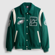 Whether you’re tailgating at Lincoln Financial Field, cheering from home, or rocking it around town, this jacket delivers the perfect blend of throwback varsity style and modern fan energy. Featuring multiple Philadelphia Eagles patches and logos, this is a must for any Eagles fan.
