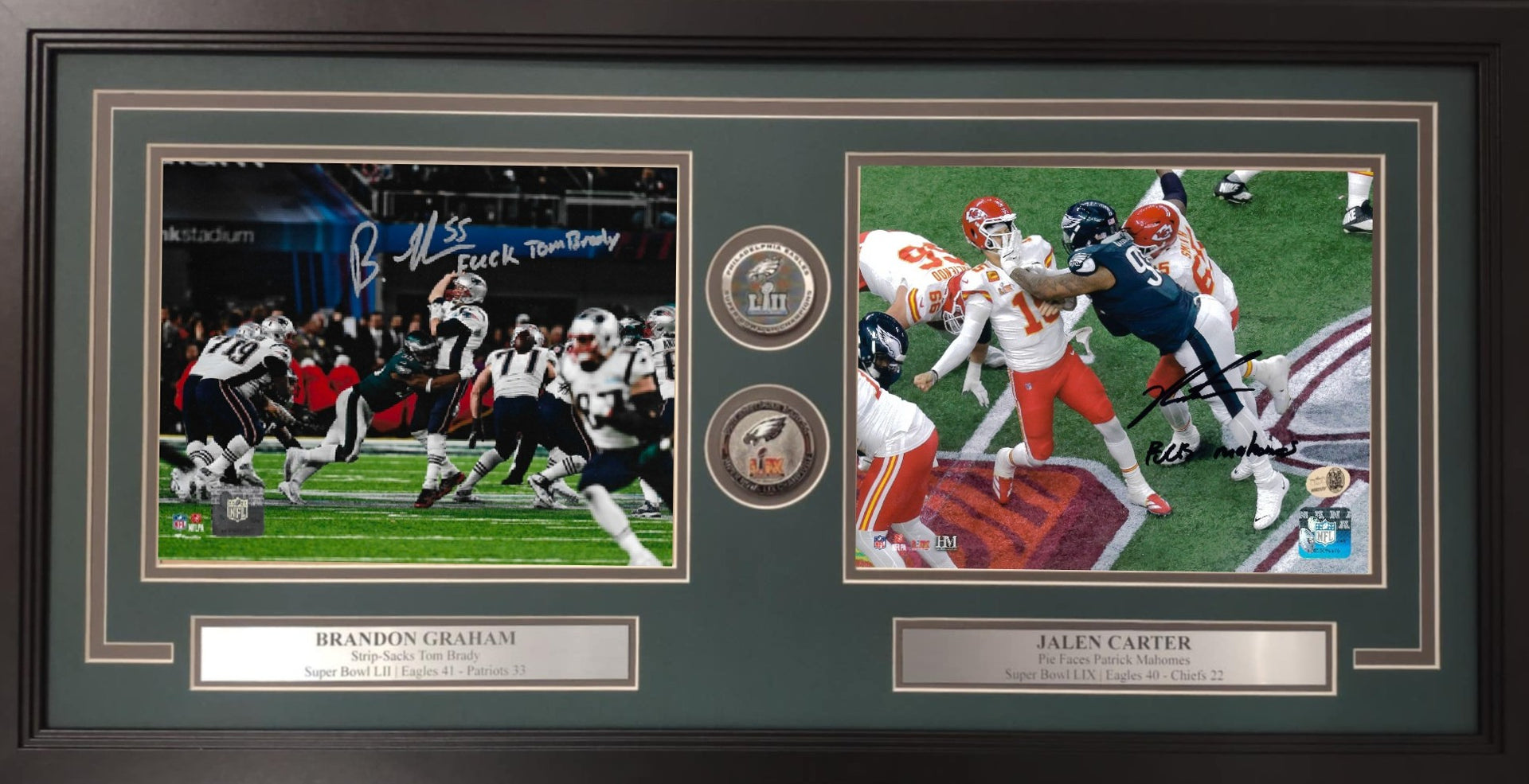 This framed photo collage shows two legendary Super Bowl plays in Philadelphia Eagles history and two legendary defensive players. The left photo shows Brandon Graham delivering a pivotal strip-sack to Patriots quarterback Tom Brady to seal the Eagles win in Super Bowl LII, and the right photo shows Jalen Carter crushing Patrick Mahomes during the Eagles' dominant win over the Kansas City Chiefs in Super Bowl LIX. Both photos have been hand-signed and include some NSFW inscriptions toward both opposing quarterbacks. The autographs have been authenticated by JSA and Dynasty Sports during public autograph appearances.