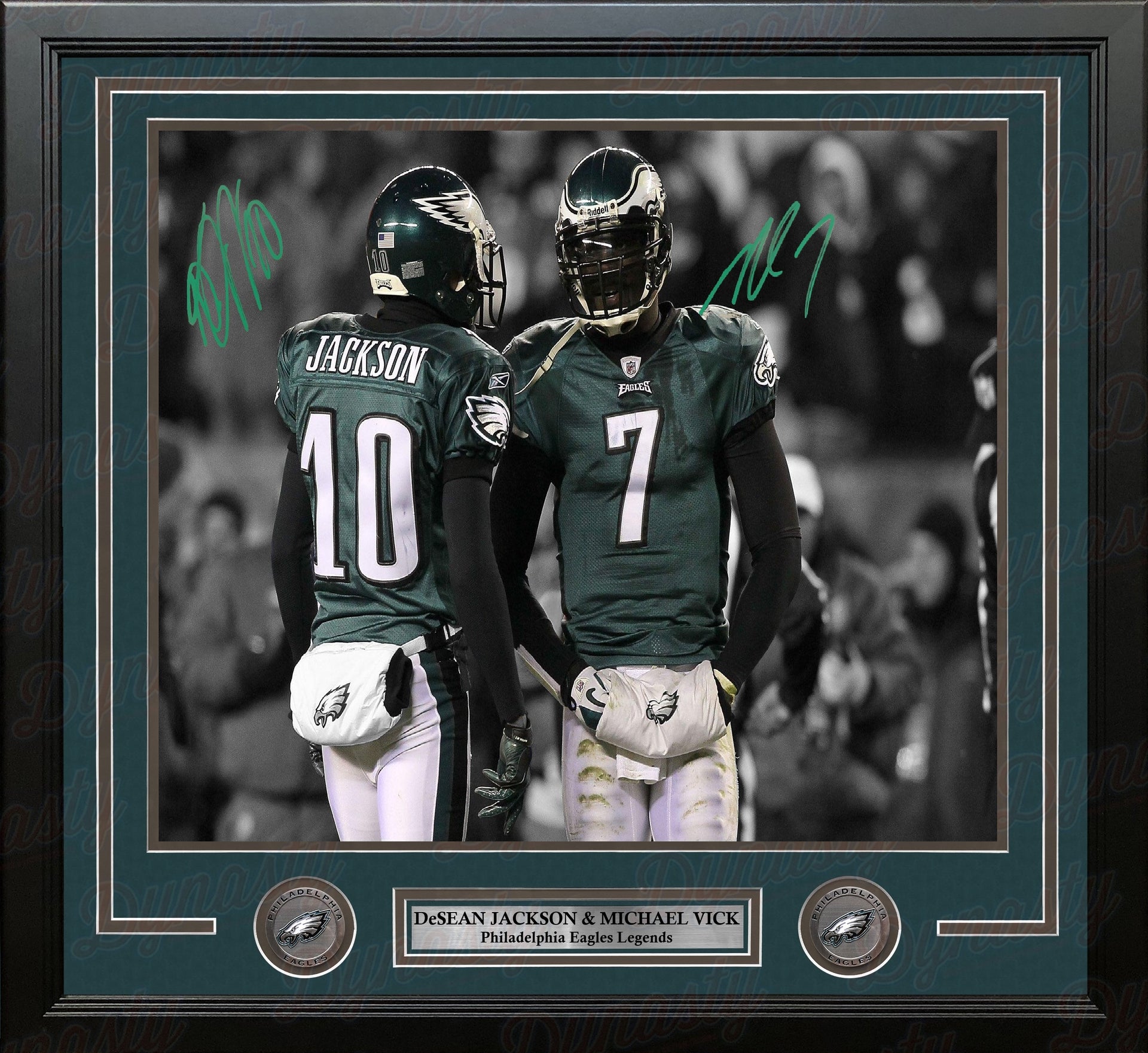 This spotlight football photo has been hand-signed by Eagles legends DeSean Jackson and Michael Vick. Both autographs have been authenticated by Dynasty Sports during a public autograph appearance.