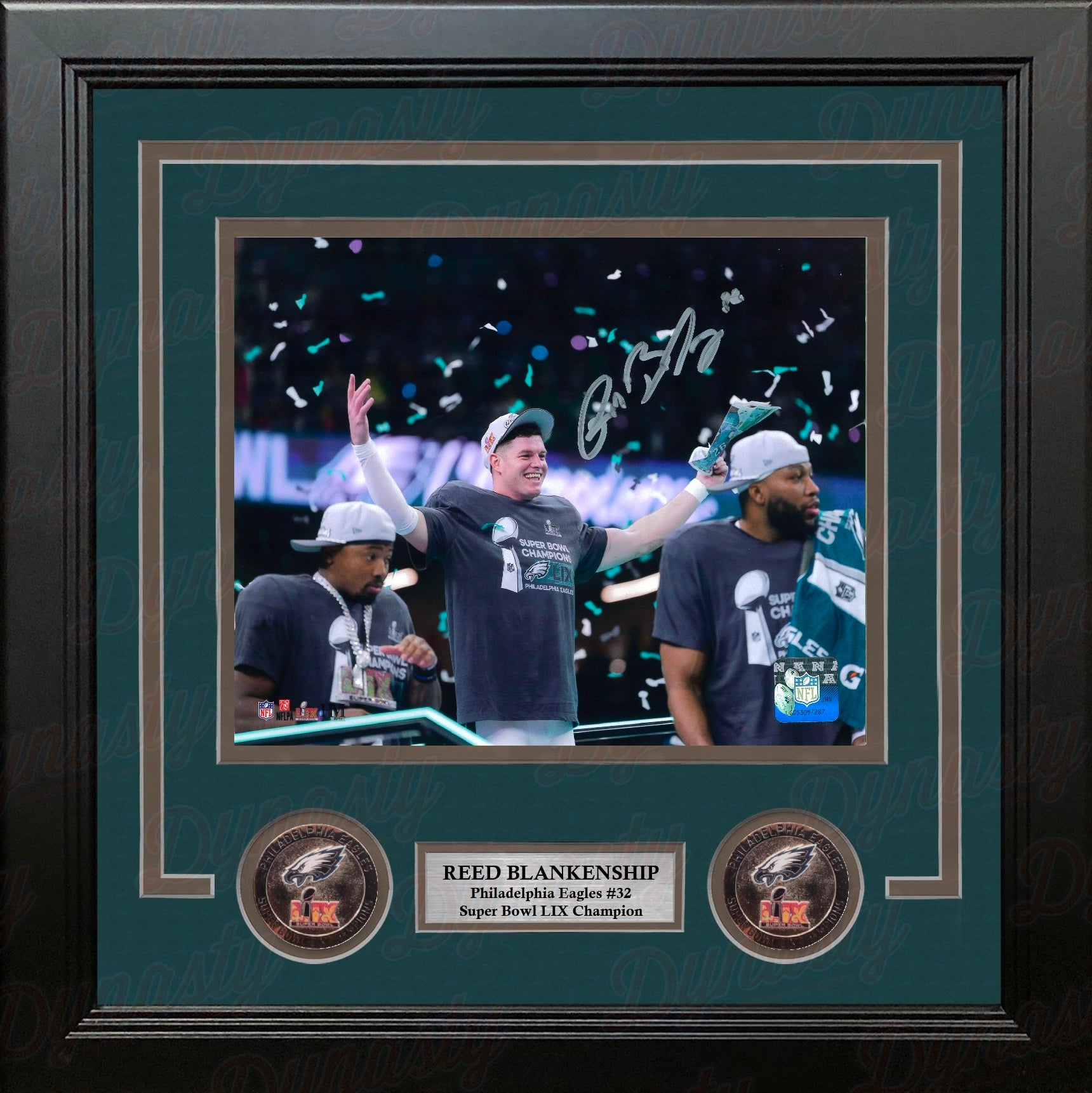This photo has been hand-signed by Philadelphia Eagles star Reed Blankenship. It has been authenticated by Dynasty Sports during a public autograph appearance.