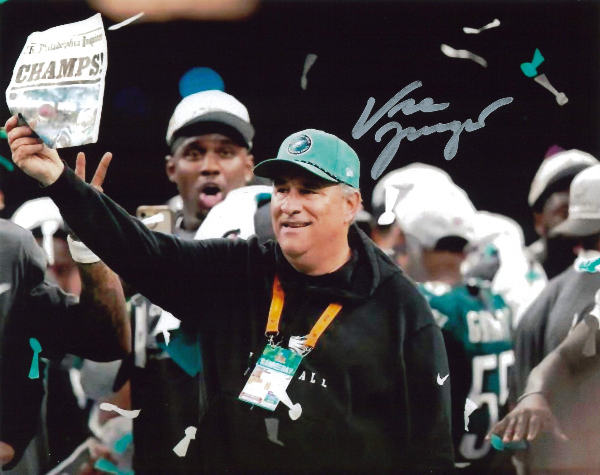 This photo has been hand-signed by Philadelphia Eagles defensive coordinator Vic Fangio. It has been authenticated by Dynasty Sports during a public autograph appearance.
