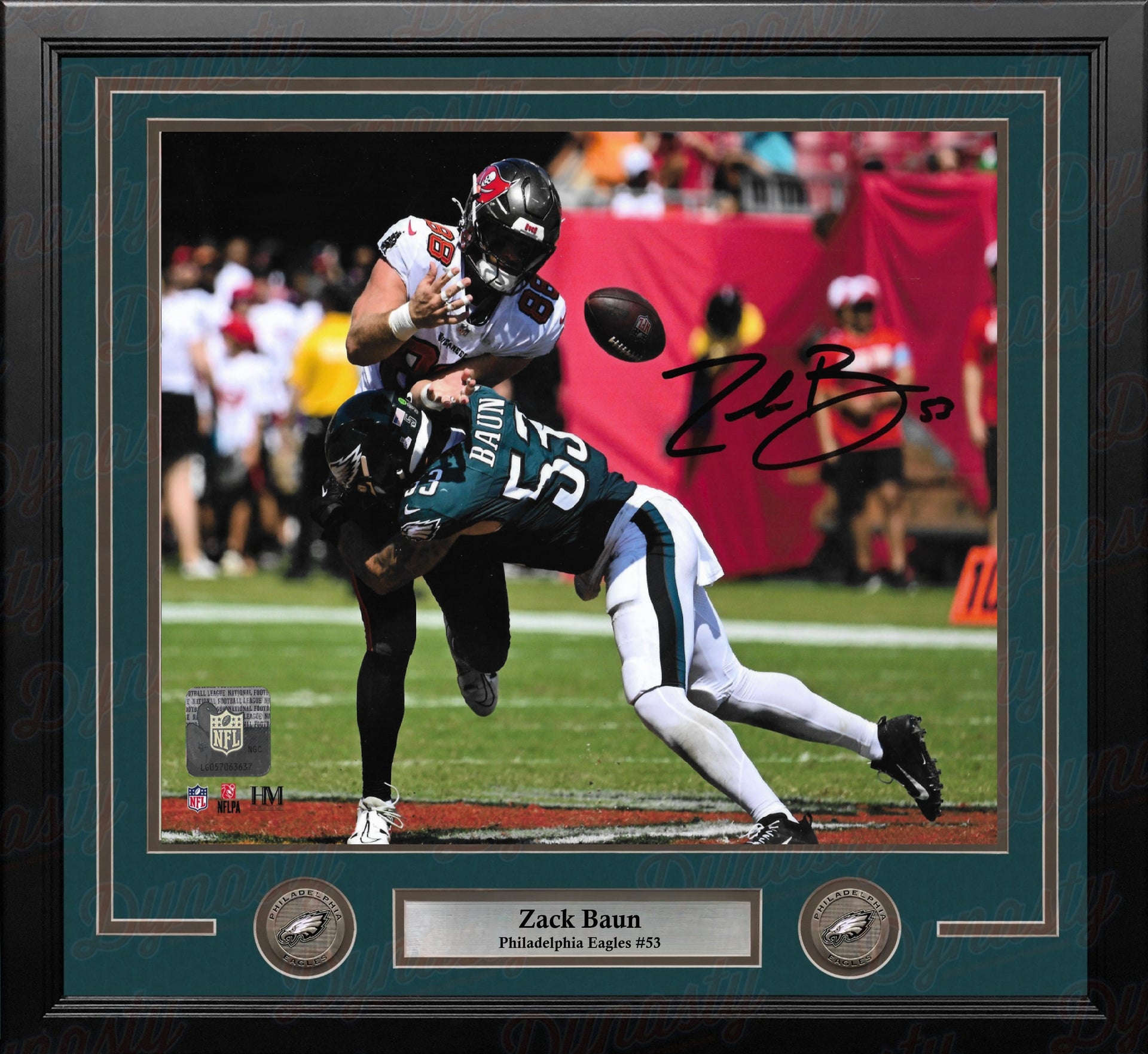 This officially licensed NFL football photo has been hand-signed by Philadelphia Eagles star Zack Baun. It has been authenticated by Dynasty Sports during a public autograph signing on November 16, 2024.