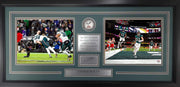 This photo collage shows Eagles star defensive back Cooper DeJean during his stellar rookie season in 2024. The left-hand image showcases Cooper piledriving Derrick Henry into the turf, and the right-hand image showcases Cooper's pick six against Patrick Mahomes during the Eagles Super Bowl LIX championship win against the Chiefs. The collage include a laser-engraved replica autograph, a commemorative 2024 season plaque, and a Super Bowl LIX championship medallion.