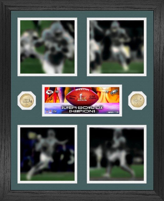 This limited edition 18" x 22" frame features in double matting under acrylic glass four 6"x 6" action photos of the Super Bowl LIX Champions key players during the game along with a commemorative Super Bowl LIX image in the center. Matted on either side of the commemorative image are two 39mm in diameter bronze minted coins; The Super Bowl LIX Champions Coin and a Super Bowl LIX Coin. A limited edition of only 2024, each Memorable Moments Photo Mint is accompanied by a certificate of authenticity making this a true collectible. Officially licensed by the NFL and NFLPA and proudly made in the USA by The Highland Mint!
