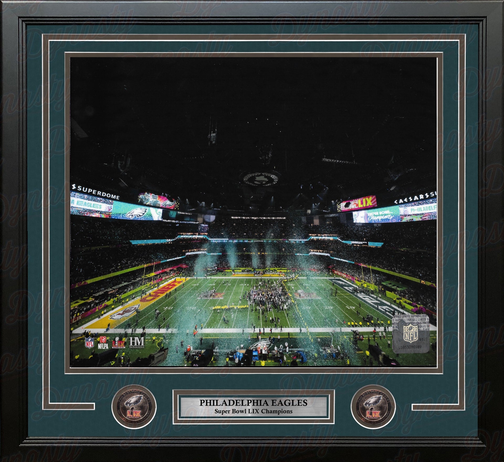 This officially licensed image shows Caesars Superdome, home of Super Bowl LIX. The Eagles are celebrating their franchise's second Super Bowl win. It has been professionally framed and matted with a commemorative nameplate.
