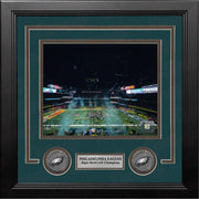 This officially licensed image shows Caesars Superdome, home of Super Bowl LIX. The Eagles are celebrating their franchise's second Super Bowl win. It has been professionally framed and matted with a commemorative nameplate.