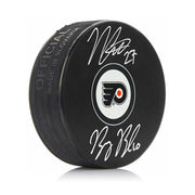 Official NHL logo hockey puck signed by Flyers stars Noah Cates & Bobby Brink; authenticated by Dynasty Sports