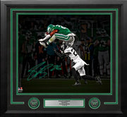 In what will be one of the most athletic plays in Philadelphia Eagles history, Saquon Barkley dazzled during the Philadelphia Eagles versus Jacksonville Jaguars game on November 3, 2024. Wearing the coveted Eagles Kelly Green jersey, Barkley juked and dodged his way through the Jaguars defense finishing off an incredible run with a backwards jump to avoid the tackle. The moment was captured perfectly while Barkley was in mid-air with two Jaguar defenders left in awe of this incredible, never before seen move. Celebrate the insane moment with the officially NFL licensed framed photo of Barkley working his magic with a special cut signature placed beneath the photo. The signature is authenticated and was signed in kelly-green paint pen.