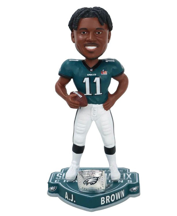 Celebrate the Philadelphia Eagles Super Bowl LIX win with the officially licensed AJ Brown Bobblehead. Each figure shows the athlete standing in front of their Super Bowl ring while wearing their Super Bowl LIX Jersey.