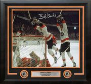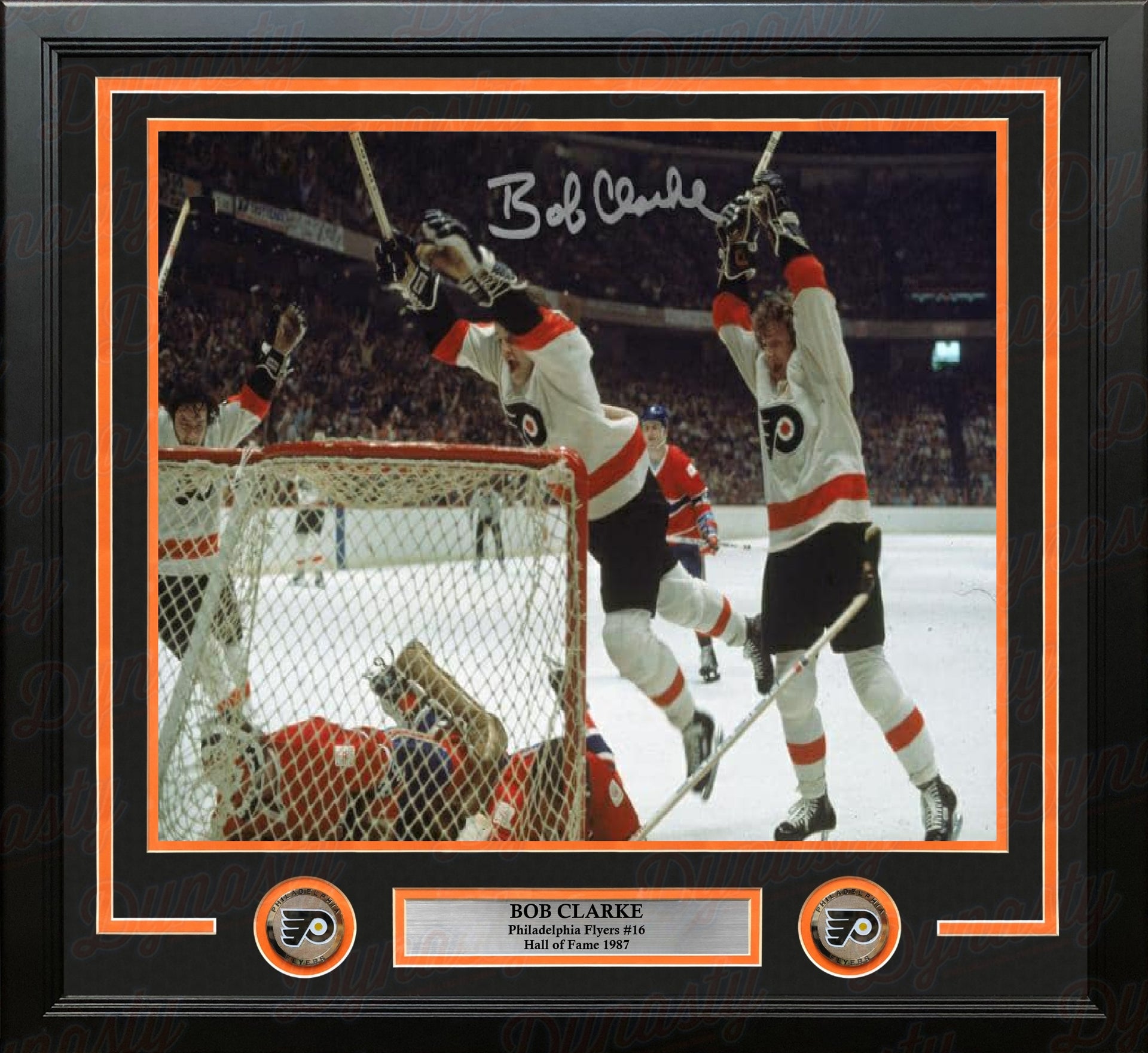 One of the most iconic shots in Philadelphia Flyers history, showcases the phenomenal LCB Line (Reggie Leach, Bob Clarke, & Bill Barber) scoring an incredible goal while celebrating mid-air. The 11"x14" photo will come personally hand-signed by Bob Clarke and will be professionally framed in Philadelphia Flyers orange and black colors.