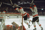 One of the most iconic shots in Philadelphia Flyers history, showcases the phenomenal LCB Line (Reggie Leach, Bob Clarke, & Bill Barber) scoring an incredible goal while celebrating mid-air. The 16"x20" photo will come personally hand-signed by Bob Clarke and will be certified authentic.