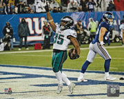 This officially licensed photo features Eagles star Boston Scott celebrating a touchdown against the rival New York Giants.