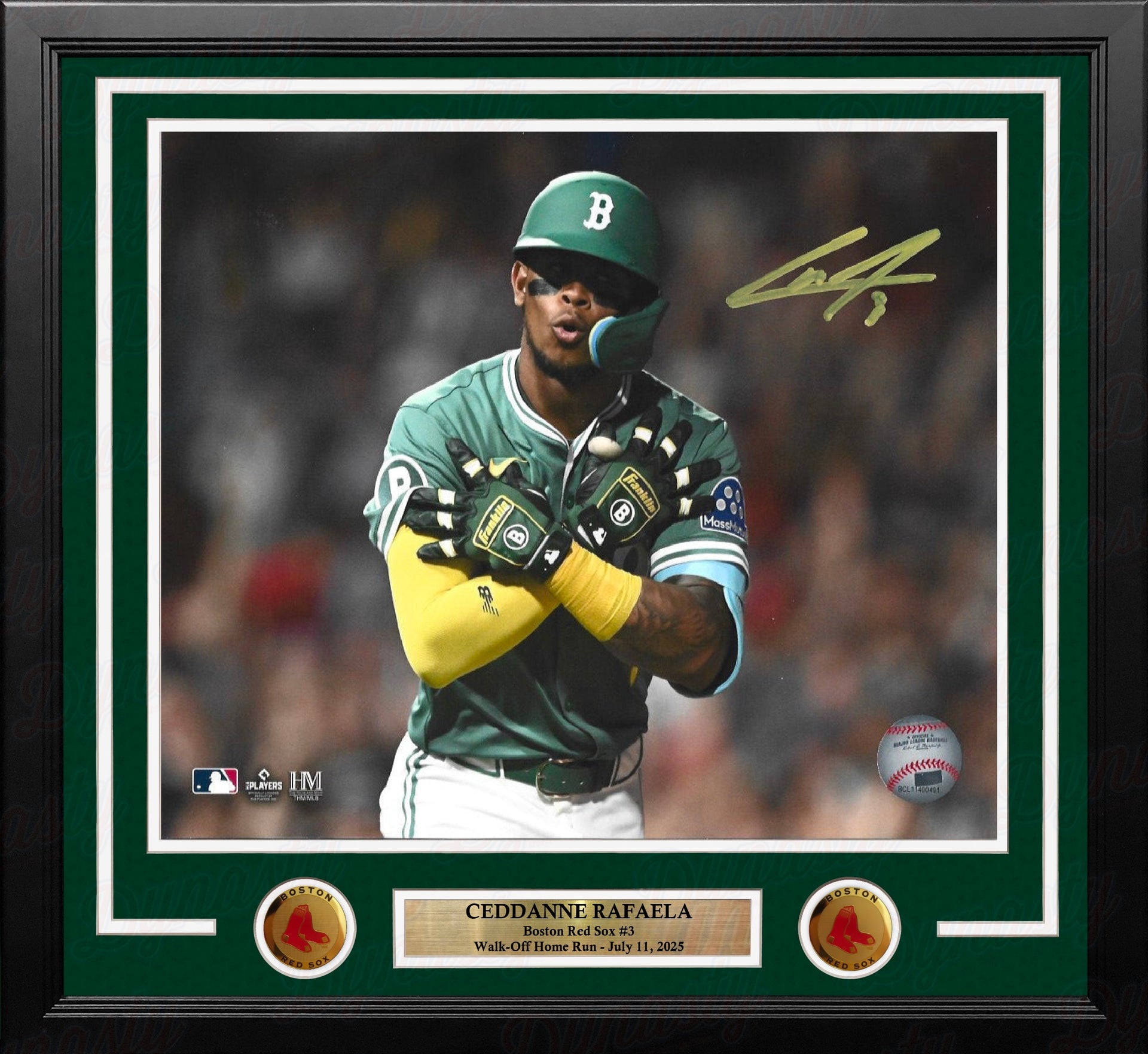 This officially licensed photo features Boston Red Sox star, Ceddanne Rafaela celebrating his monster 2 run walk-off home run on July 11, 2025, against the Tampa Bay Rays at Fenway Park. The photograph has been hand-signed by Ceddanne Rafaela during his public appearance at our Northshore Mall location on September 11, 2025.