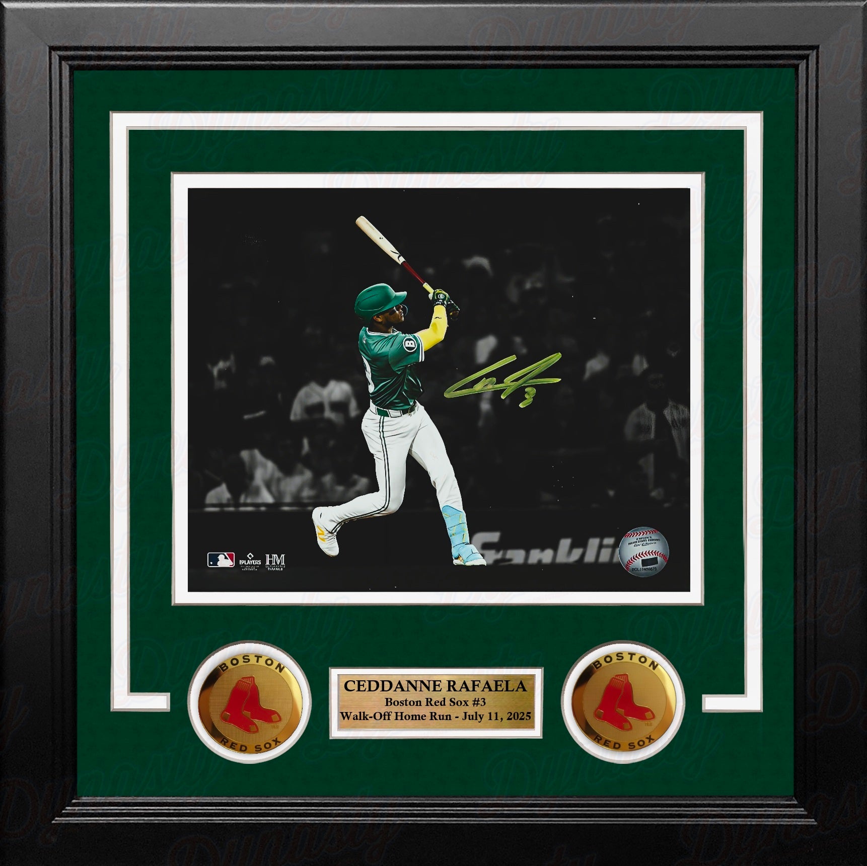 This officially licensed photo features Boston Red Sox star, Ceddanne Rafaela hitting his monster 2 run walk-off home run on July 11, 2025, against the Tampa Bay Rays at Fenway Park. The photograph has been hand-signed by Ceddanne Rafaela during his public appearance at our Northshore Mall location on September 11, 2025.