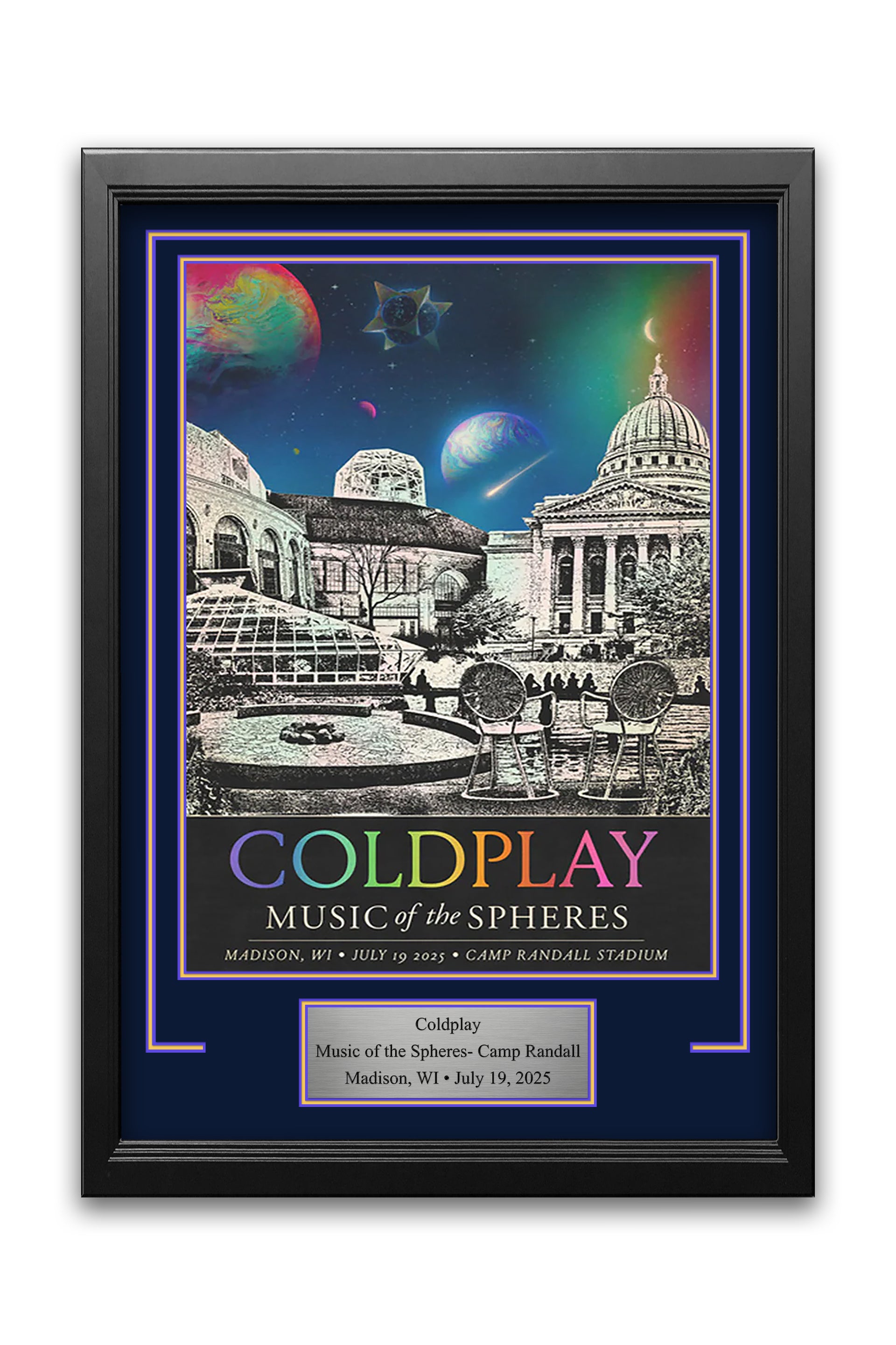 On July 19th, 2025, Coldplay took the stage at Camp Randall Stadium for a memorable night of rock. The event was honored with a beautiful concert poster that sold-out in minutes. For those lucky to secure one, Dynasty Sports is offering a special custom-frame kit made specifically to honor the special night. The frame includes everything you need to protect and hang your Coldplay concert poster including the frame, matting, special engraved commemorative plate, and hardware to hang directly on your wall.