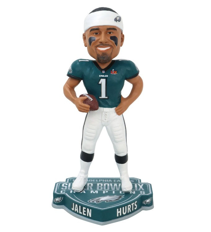 Celebrate the Philadelphia Eagles Super Bowl LIX win with the officially licensed Jalen Hurts Bobblehead. Each figure shows the athlete standing while wearing their Super Bowl LIX Jersey.