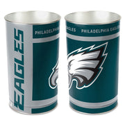Support your favorite football team with the officially licensed NFL trash can. These metal wastebaskets are a great way to decorate a room or office. Wastebaskets are 15" tall by 10.25" diameter.
