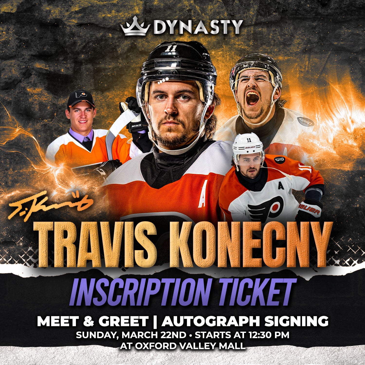 One of the Flyers' most beloved members is coming to Dynasty Sports! Join us on Sunday, March 22, 2026 as we host fan-favorite, Travis Konecny for a very rare public signing event. Travis will be appearing at our Oxford Valley Mall location beginning at 12:30pm where he will be signing autographs and taking photos with the fans who attend.